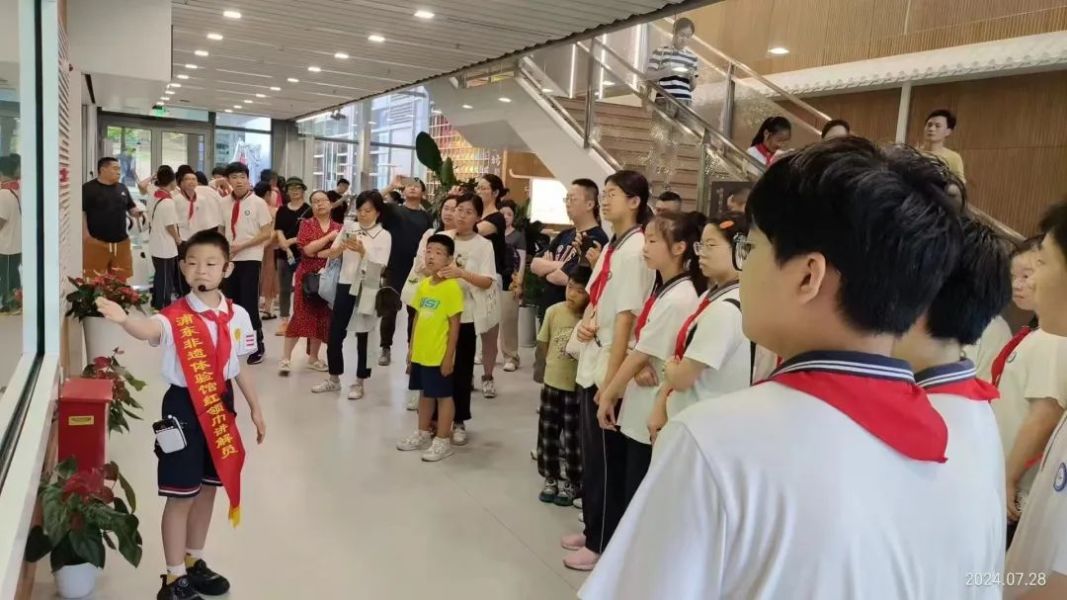 暑期伊始,浦东新区非遗体验馆2024暑期红领巾讲解员活动面向全社会招募学生志愿者,报名情况火爆到出人意料。通过线上初试,300名10-15岁的小选手进入面试环节,最终选拔出100名热爱非遗文化、具备良好语言表达能力和团队协作精神的青少年志愿者。他们中,有人能用普通话、沪语、英语“三语”讲解,还有人自己就掌握了某项非遗技艺,通过现场展示,实现推广非遗和“讲解”非遗。