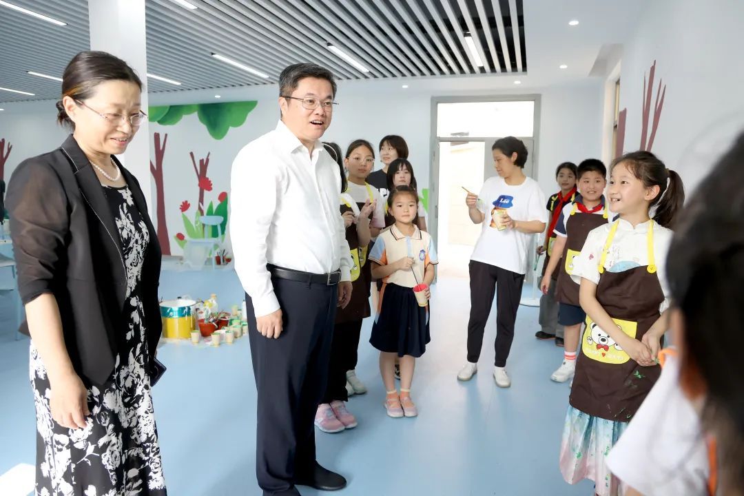上海市第二师范学校附属小学(杨浦北校)地处五角场城市副中心,学校秉持人民教育家于漪老师提出的“学会求知、学会生活、学会做人”的育人目标,关注学生的习惯培养、能力提升、人格奠基,积极培养“晨曦好少年”。薛侃在学校图书室里遇到了正利用暑假时间埋头创作绘画的老师和孩子们,他对师生们培养兴趣爱好,促进德智体美劳全面发展表示充分肯定。随后,薛侃来到心悦活动室、创新实验室等功能区域,与正在整理教具、手绘板报的老师们亲切交流互动。