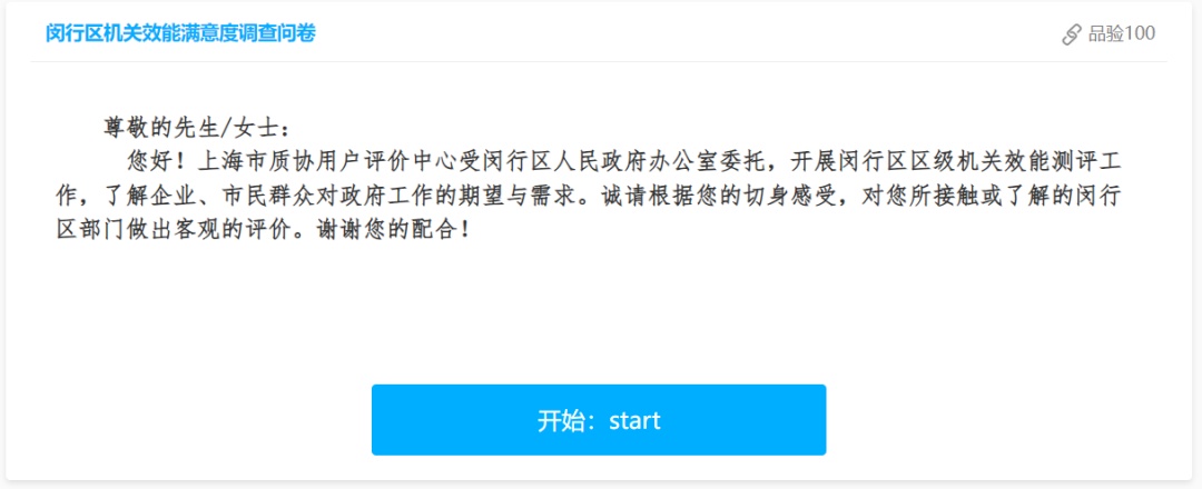 本次问卷调查采用不记名的方式开展,请各位市民踊跃参与,为推进闵行区机关效能建设工作,行使您的权利,提出您宝贵的意见!