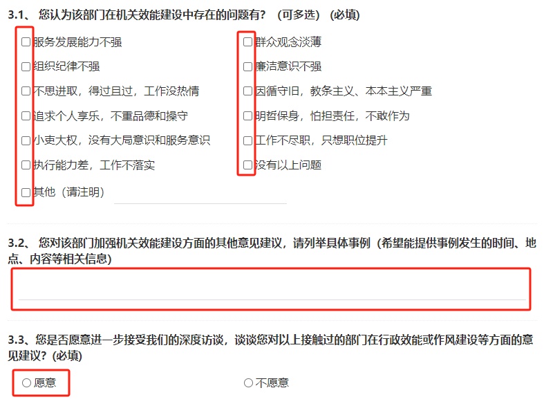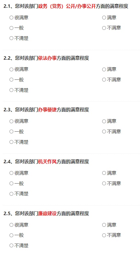 4.对该部门的政务(党务)公开/办事公开、依法办事、办事便捷、机关作风、廉政建设等方面逐一进行满意度评价;