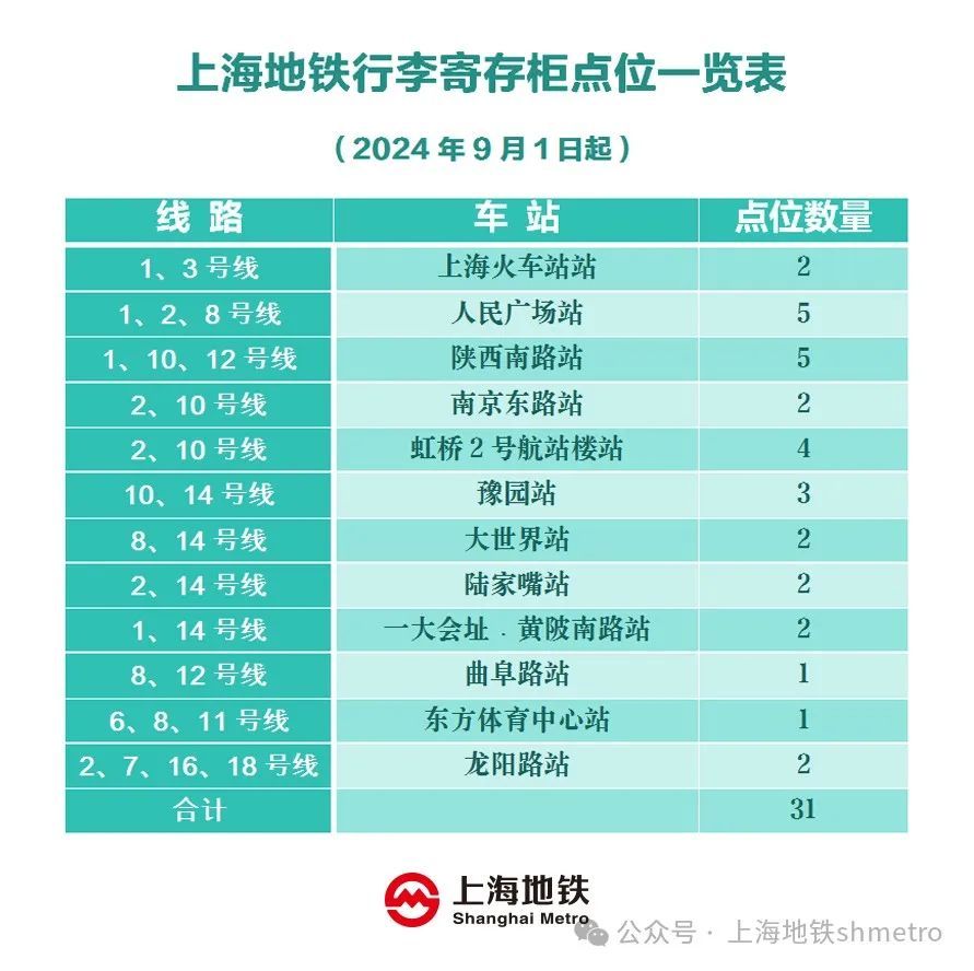 为此,从9月1日起,在启动寄存柜收费服务的同时,上海地铁将原先12座车站24个寄存点位的332个柜子扩容至31个寄存点位(详见:上海地铁行李寄存柜点位一览表)的736个柜子,增幅超过120%,且新增寄存柜以大、中型柜体为主,以更好满足市民游客的需求。