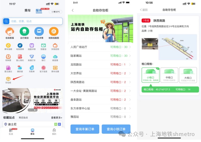 9月1日起,乘客除了使用“小铁”“丰巢”小程序查询外,也可以通过“Metro大都会”App查询地铁站点行李寄存柜的位置以及可用格数【查询方式:打开“Metro大都会”App,在“乘车”页面点击顶部的“服务”,进入地铁服务页面后点击页面内的“寄存柜”功能进行查询】。在使用行李寄存柜时,除了使用支付宝或微信外,也可以点击“Metro大都会”App“生活”页面,用右上角“扫一扫”功能扫描寄存柜上的二维码使用该项服务。