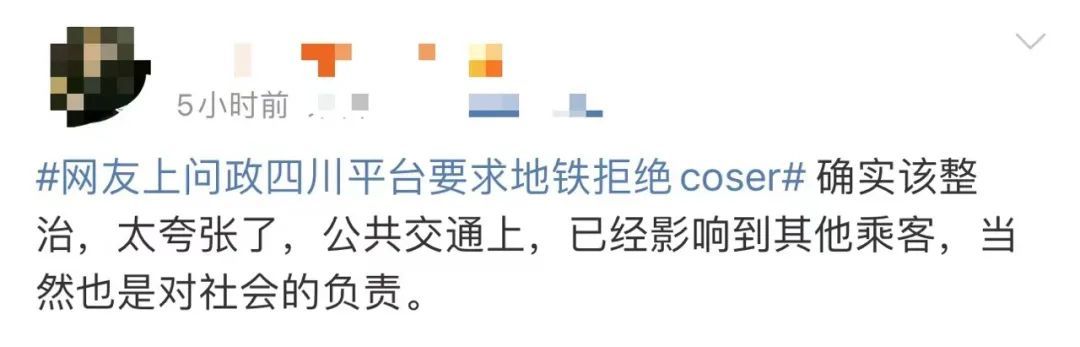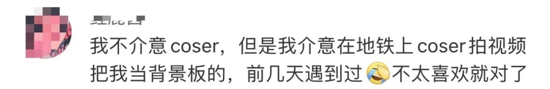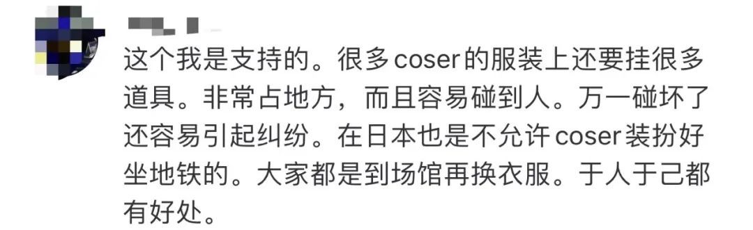 也有网友认为,coser的服装道具占地方,容易引发纠纷,应拒绝其进地铁↓