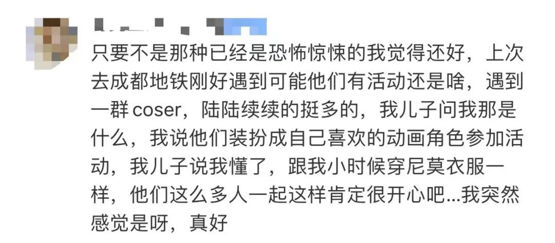 随后,相关话题冲上热搜。不少网友表示:只要不是惊悚恐怖的装扮,支持coser进地铁↓
