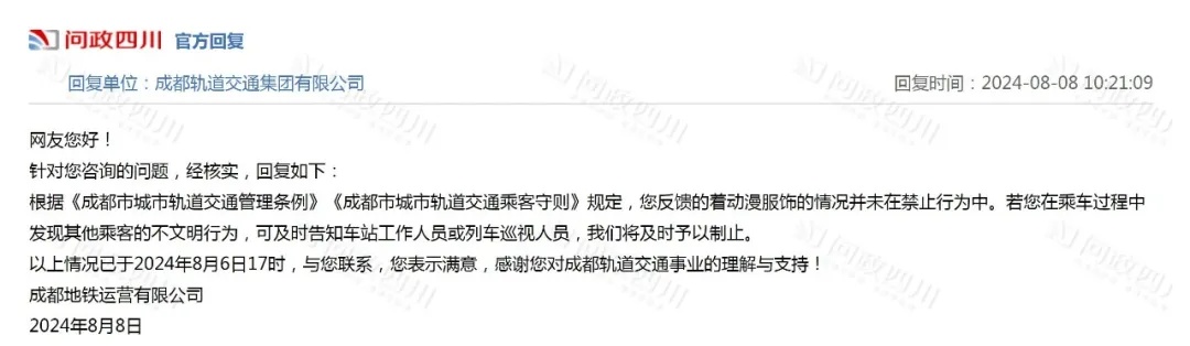 对于建言中“地铁安检应拒绝穿着奇装异服coser(角色扮演人)乘坐”的建议,成都地铁运营有限公司回复,“根据相关规定,着动漫服饰的情况并未在禁止行为中”。