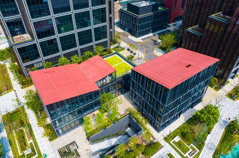 近期,临港智创TOP B区新建项目正在加速建设。作为祁连山路—真南路双主干道上的地标型建筑群,象征“生长”的新建项目多元化品质空间齐全、绿色生态与功能亮眼,与传承文脉的英雄金笔厂工业历史保留建筑群对比鲜明、形态融合呼应。让我们走进新建项目,欣赏一下花园式办公美图吧! 地标群建筑打造高标准城市界面 当前,B区新建项目已完成楼宇内部全装修、园区内部道路和景观建设。T1、T2塔楼“水晶皇冠”具有高辨识度,一系列退台布满绿植,点缀高层商务观景与休憩空间,结合充满科技与现代感的玻璃幕墙,融入桃浦绿色城市界面。 ▲B区鸟瞰图与塔楼实景 裙楼锯齿形屋顶造型与保留项目相呼应,更好地呈现历史与现代融合的工业风格。玻璃幕墙的竖向肌理,再次散发出英雄奋发不息、创新向上的动力,错落分布的绿植屋面不仅增添宜人的自然景观,更能够缓解雨洪和热岛效应,实现低碳环保的绿色城市效益。 ▲新建项目裙房实景图 品质园区打造优越商办环境 步入新建项目,灌木成片、绿树成荫,郁郁葱翠的园区环境给人留下移步换景的美好印象,绿色城区里的绿色园区形象愈发深入人心。园区内部设置导视牌、凉亭、长椅、艺术装置,亲近自然的同时,为办公、商业、社交、娱乐等多功能的集成开辟高品质空间。 ▲B区新建项目环境宜人 楼宇大堂轩敞明亮,电梯两侧“一脸通行、一码通行”等门禁、梯控设施齐备,为AI Park智慧园区增添新场景、新功能打下基础。屋顶花园绿植葱翠,开辟了一处视野开阔、风景宜人的商务休闲与洽谈空间,高端智慧的商办氛围尽显活力。 ▲B区新建项目楼宇内景与绿色屋顶 英雄归来,创新与共。智创TOP着力打造高品质城市更新作品,以优质载体推动高端功能导入与前沿企业招引,为桃浦地区产业经济发展、科创空间建设、产城融合升级增添动力。