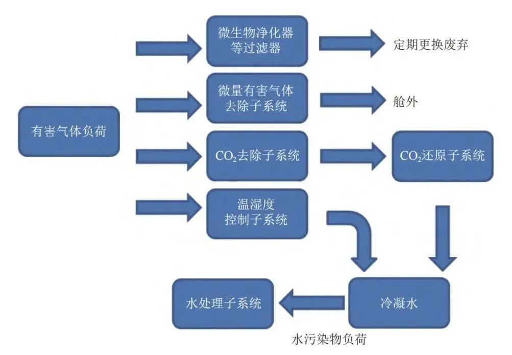 航天员的汗液和呼出水汽挥发至座舱大气中,被温湿度控制子系统以冷凝除湿的方式实现收集。根据系统分析和研制经验,空气中的部分有害气体负荷会随着冷凝水转移成为水污染物负荷,最终通过水处理子系统完成深度净化处理。