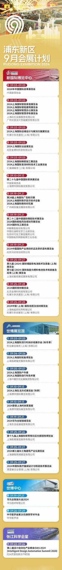 9月,浦东将有哪些会展举行?在新国际博览中心,将举办2024年中国国际皮革展览会、2024上海国际智能家居展览会等;在世博展览馆,将举办2024上海国际流行时尚纱线展示会(秋冬季)、2024上海国际轮胎博览会等;在世博中心,将举办华为全联接大会2024等;在张江科学会堂,将迎来第二届设计自动化产业峰会等。一起来看详情。