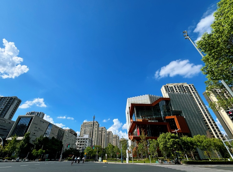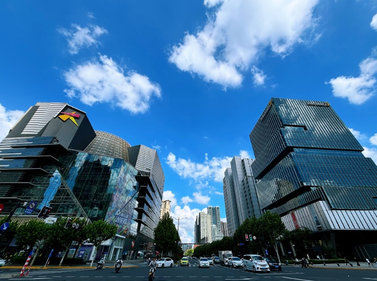 高耸的楼宇代表着现代都市的繁华与进步,而清澈的天空则是大自然的恩赐。两者相映成趣,让人感受到现代文明与自然环境的和谐共生,带来一种独特的审美体验。