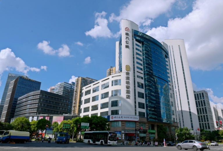 现代化的高楼大厦挺拔而立,玻璃幕墙在阳光下闪耀着耀眼的光芒,与蓝天形成鲜明对比,展现出都市的繁华与活力。