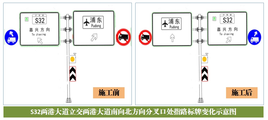 两港大道由南向北通行的车辆行驶方向有所改变:原往S32方向的车辆在左侧,往浦东机场方向的车辆在右侧。翻交后,往S32方向的车辆在右侧,往浦东机场方向的车辆在左侧。