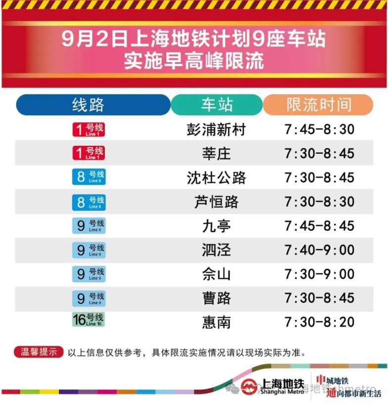 申通地铁集团介绍,9月2日,上海地铁早高峰限流措施将继续实施,届时将有9座地铁站早高峰计划限流。