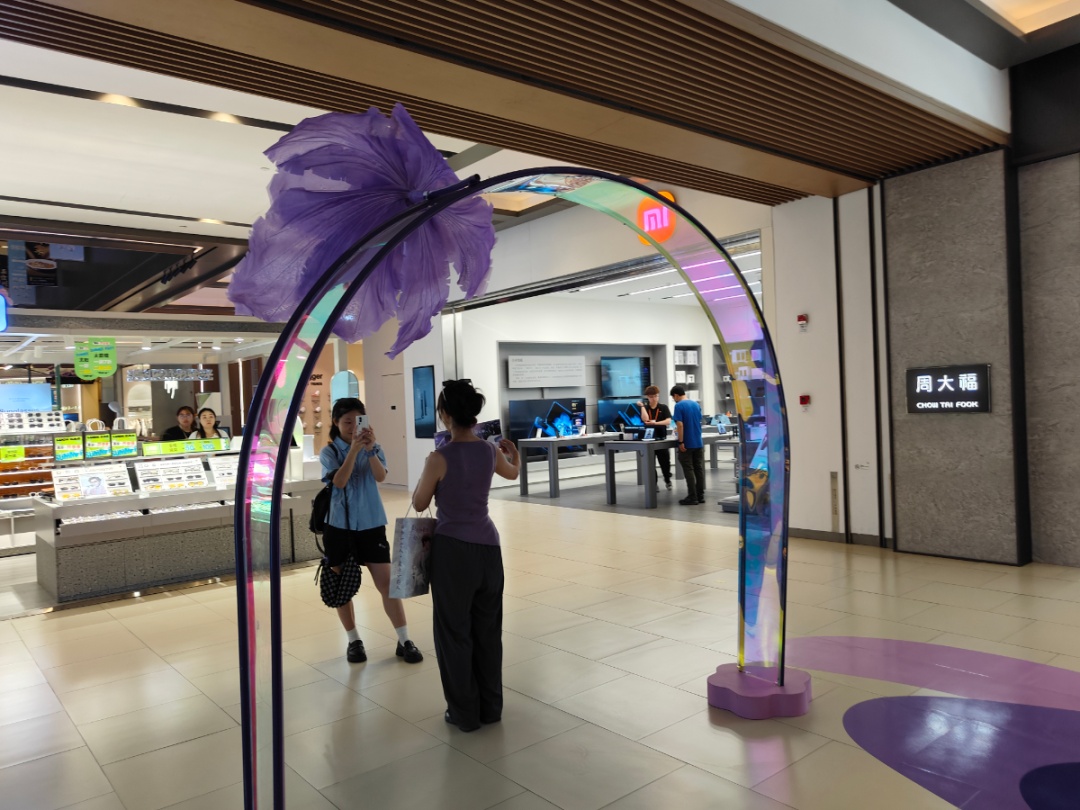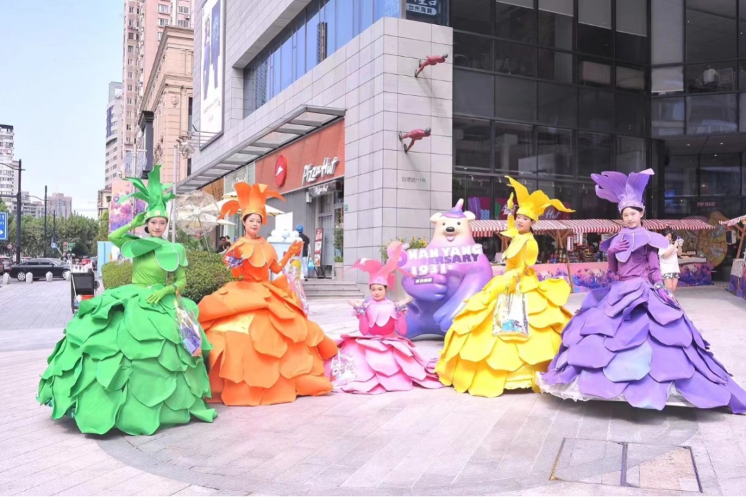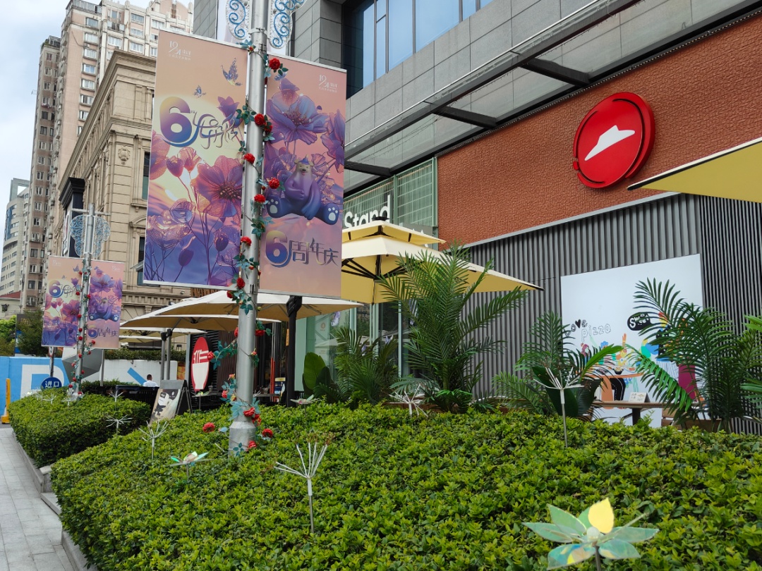 六年前,南洋1931花落徐家汇,坐落于裕德路165号,是一个占地总建筑面积超过5万平方米的大型综合性商业体,汇集了众多品牌商铺和餐饮店铺,可以满足顾客“吃饭、娱乐、购物、学习、亲子”的多种需求。来到南洋1931,最引人瞩目的是周年庆的美陈——在商场的整个外圈制作了以紫色为主色调的“花路”,紫色的花朵元素贯穿了南洋1931的所有设施。紫色的招风旗、门口坐着一只憨态可掬的紫色大熊、玻璃幕墙、地板、楼梯……紫色元素无处不在。一楼大堂中间的顾客休息区,装饰了硕大的紫色花朵,宛如童话世界,吸引了不少顾客驻足拍照。“拼搏无边界”“勇者无惧”“以梦为马不负韶华”……一句句缠绕着美丽花束的话语,是南洋1931希望通过庆典向外界传达的理念和力量。