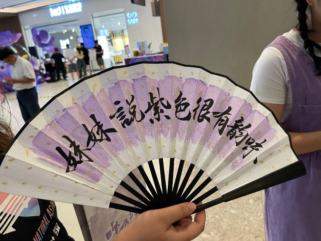 不仅如此,南洋1931还将二楼楼面腾出来举办粉丝活动,粉丝们凭演唱会门票可以领到小礼物,有小扇子、应援手幅等物品,上午十一点不到,二楼就挤满了排队等候礼品的粉丝。有趣的是,队伍中不少小哥哥、小姐姐都穿着紫色系的衣服,紫色的T恤、紫色的裙子,还有母女俩穿着紫色亲子装,和南洋1931的紫色“花路”相映成趣。