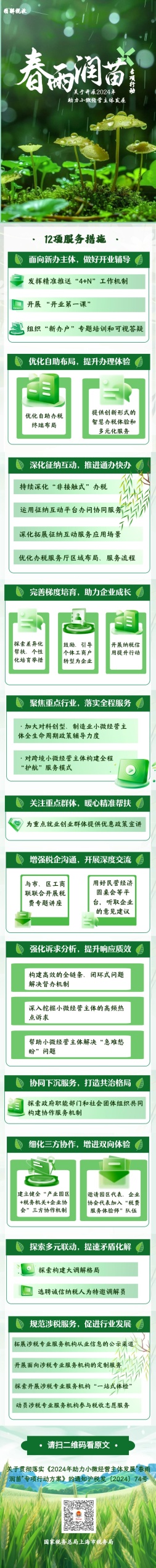 市税务局、市发展改革委介绍,为持续优化小微经营主体税费服务,促进民营经济发展壮大,国家税务总局上海市税务局等部门发布了《关于贯彻落实〈2024年助力小微经营主体发展“春雨润苗”专项行动方案〉的通知》(点击“这里”可查看全文),重点推出12项服务措施。详见↓