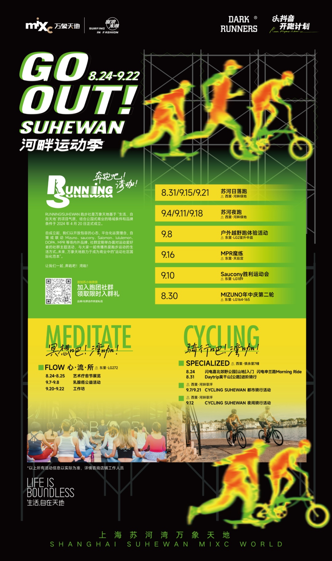 即日起至9月22日,上海苏河湾万象天地携手都市运动文化推广团体DarkRunners共同发起“GO OUT!SUHEWAN河畔运动季”,联合25家运动先锋品牌,组局20余场运动聚会,都市路跑、户外越野跑、都市骑行,穿梭于自然与都市的脉搏之间,在城市的光影交错中感受速度与激情……每场运动局都充满挑战与乐趣,满足不同年龄、不同兴趣的运动爱好者。