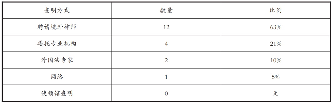 在实践中,大多数案件当事人选择委托境外专业律师查明外国法,但是在该类方法涉及的案件中,全部案件为涉港案件,并未涉及其他国家和地区。在《最高人民法院关于适用〈中华人民共和国涉外民事关系法律适用法〉若干问题的解释(一)》(简称《解释(一)》)出台之后,当事人聘请境外律师、外国法专家等获得的外国法查明结果,在经认证、公证和翻译程序后才可为法院认可。但是,截至2023年8月仍无通过使领馆查明外国法的案件(详见表2)。