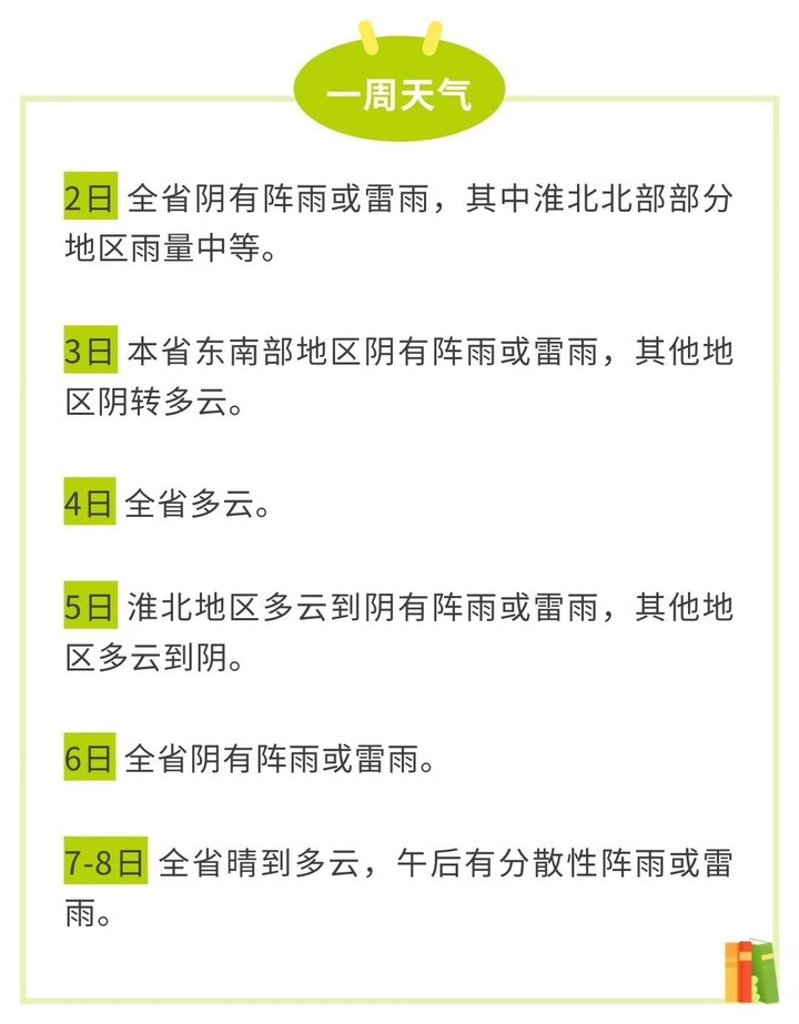 今天,江苏省气象台也发布了未来一周天气预报,本周江苏多阴雨,部分地区仍有高温天气。今天夜里到明天,我省东南部地区有分散性雷阵雨。9月5 日后期-6日受冷空气影响,全省自北向南有一次降水过程。9月5日西南部地区,7-8日沿江和苏南部分地区仍有35~36℃高温天气。