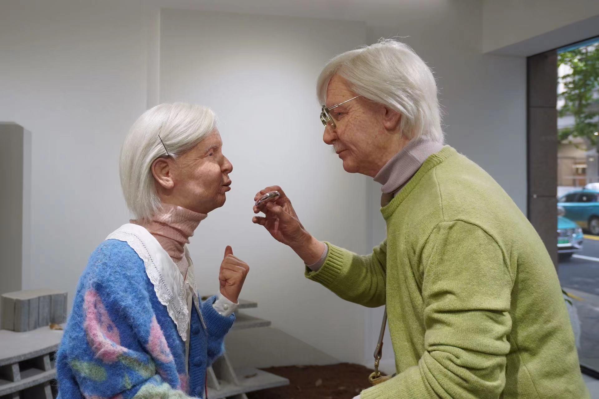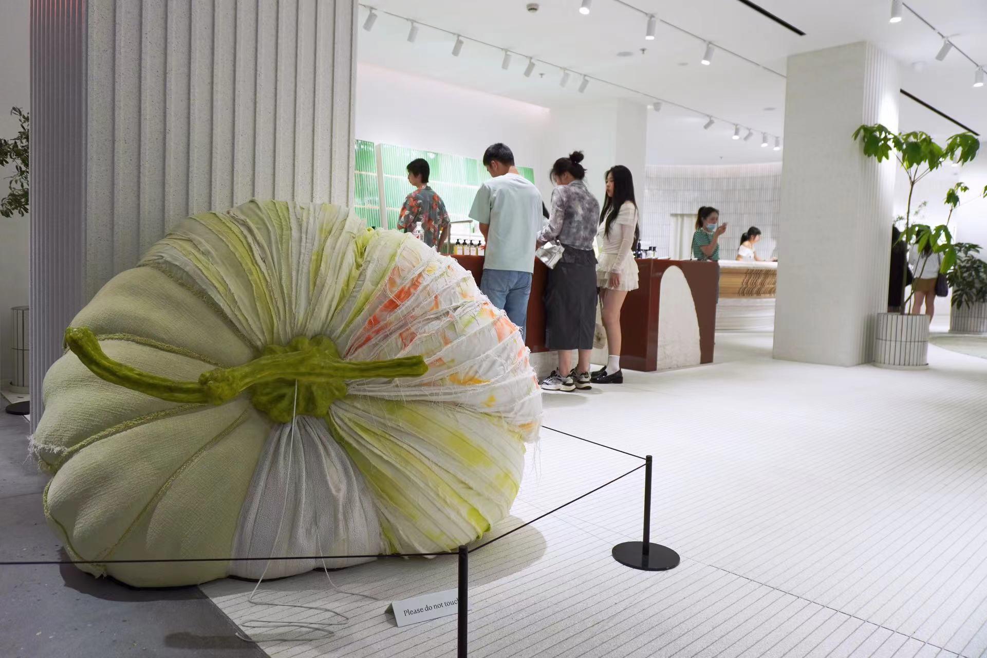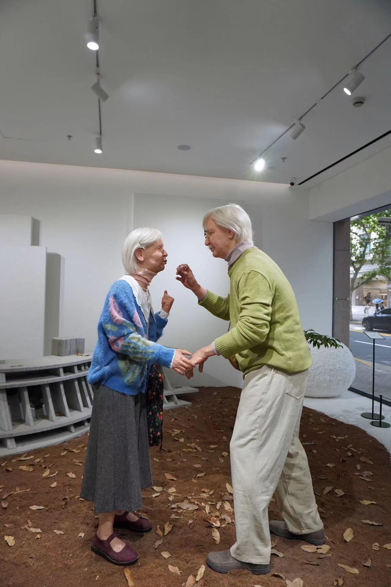 在一楼临街处,一对老年雕塑艺术装置格外夺人眼球,男士手持某品牌的“南瓜味香氛”赠予爱人,空气里都弥漫着罗曼蒂克的气息。