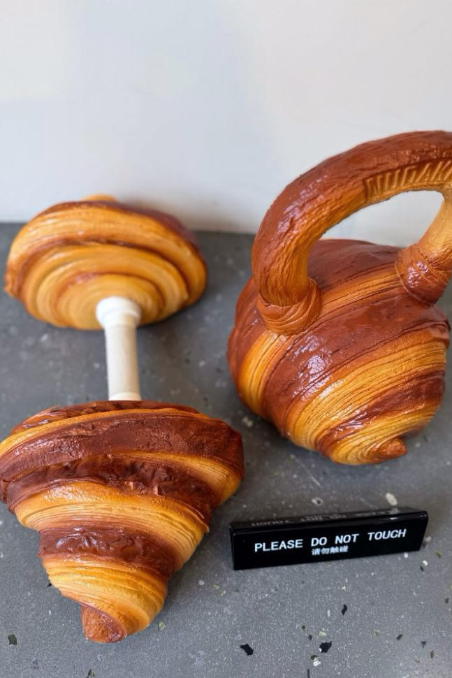 “可颂健身房”则是以可颂为艺术展览元素,不仅有可颂健身器材,还有可颂桌、面包椅等,非常适合拍照,再来一杯可颂咖啡,时髦新颖之余充满了松弛感。