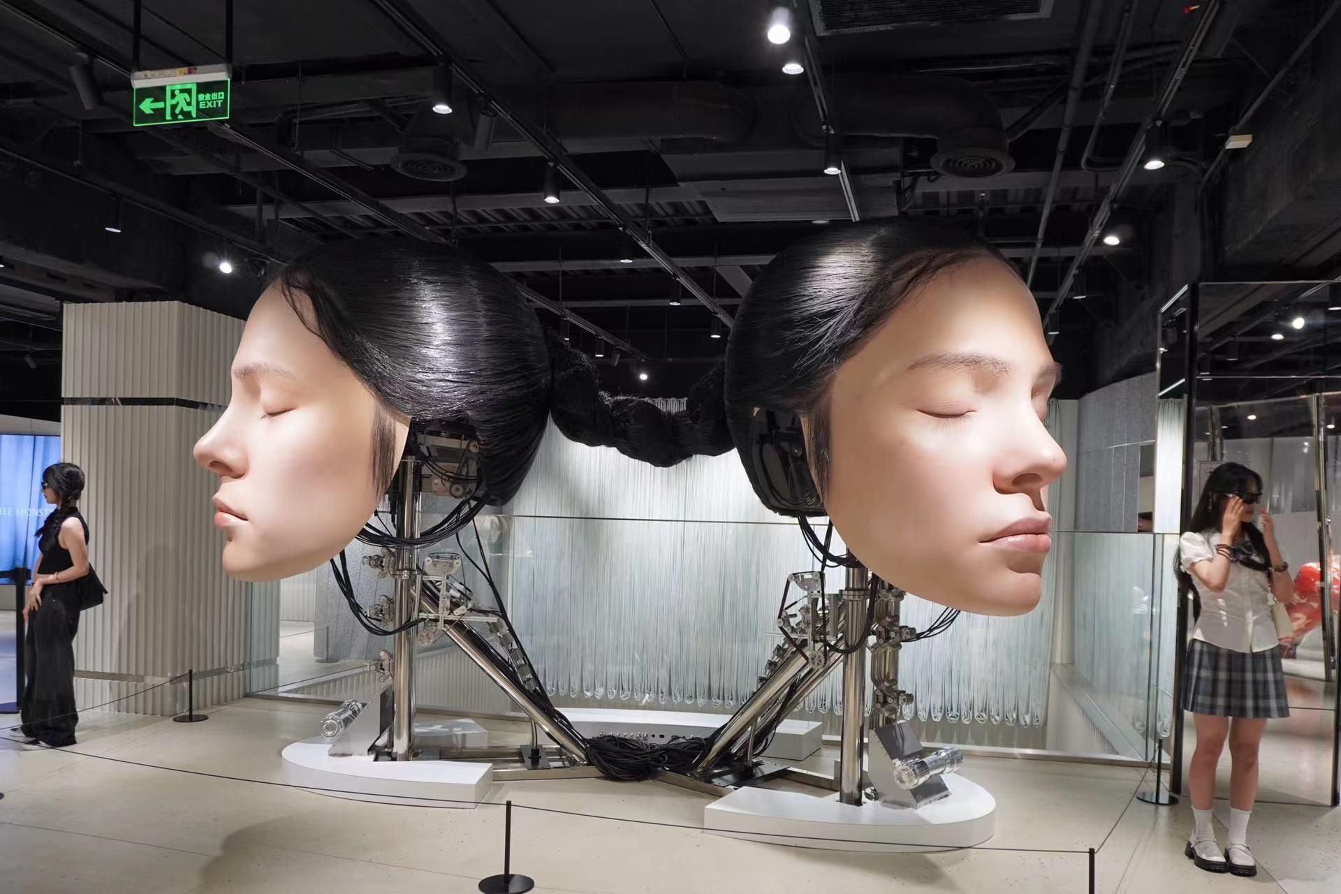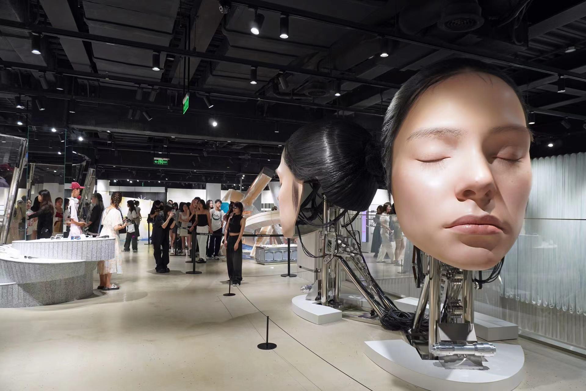 二楼的零售空间也随处可见纵横交错、前卫时尚的艺术装置,与简洁明朗的空间元素形成鲜明对比。极具“先锋性”和“科技感”的巨型双人脸装置是最吸引潮人打卡的出片圣地,不仅颜值在线,基本每天都要排长龙才能站在C位与机械巨人脸合个影!