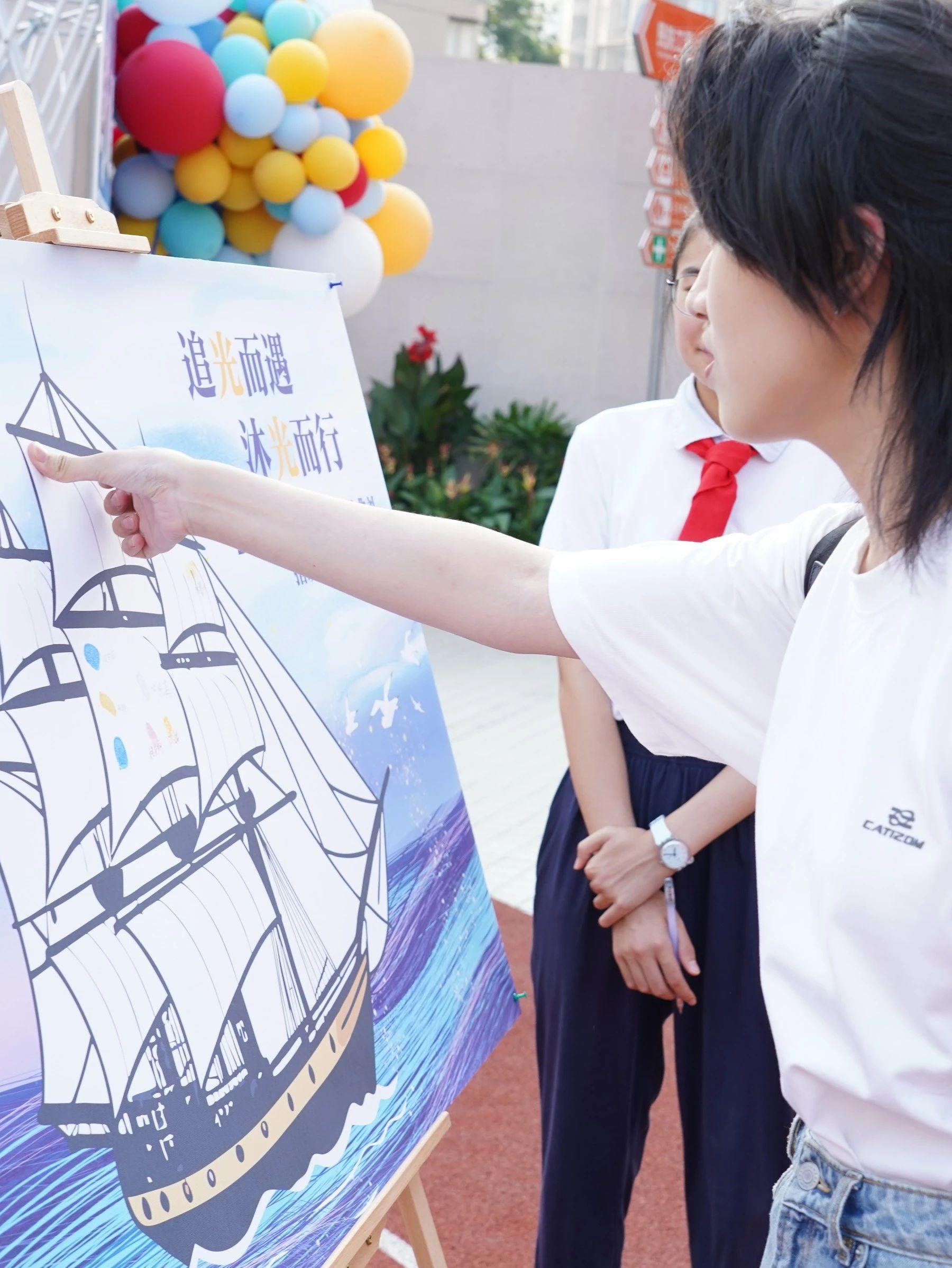 清晨,阳光洒满校园,为新学期的开始铺垫了金色的氛围。学生们带着对新学期的期待和憧憬,纷纷踏入校园,以指纹签到的方式在画板上留下自己的印记。这些指印汇聚成一艘五彩船只,象征着学生们将承载着创意和梦想,在新学期里乘风破浪,追光航行。