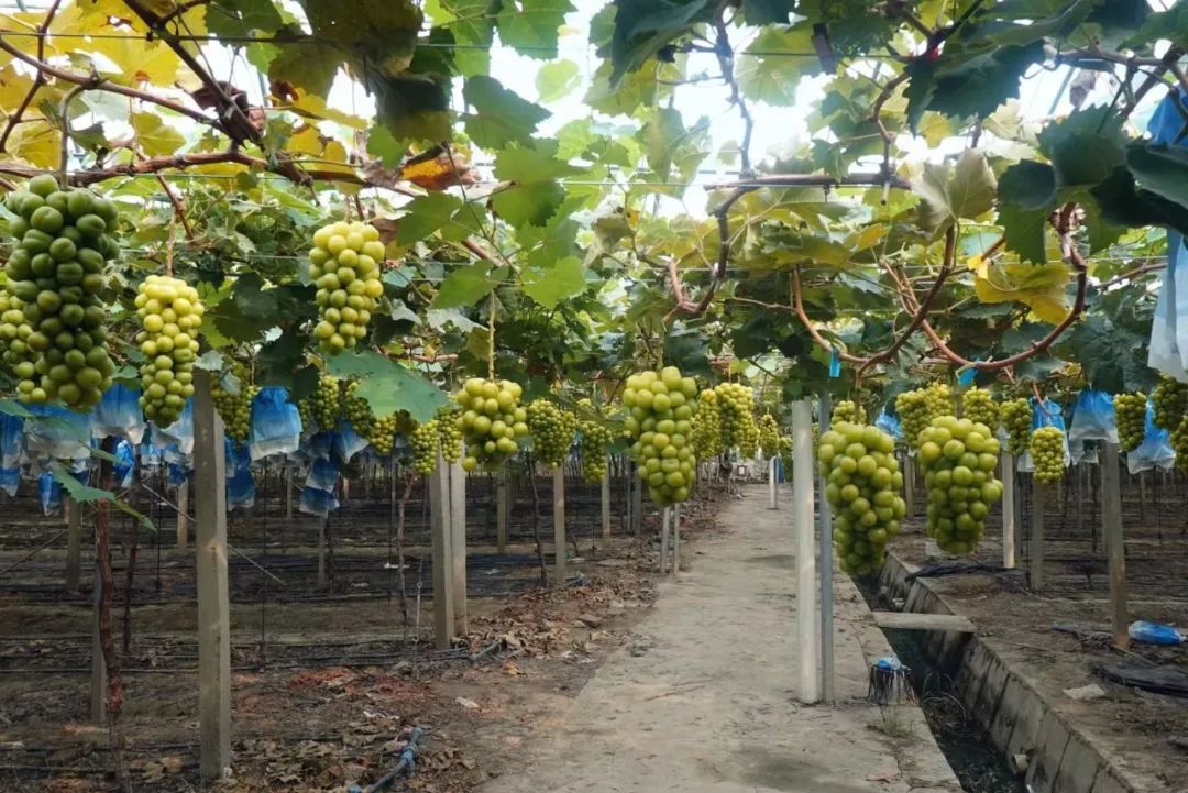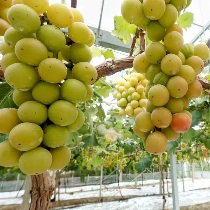 据介绍,基地内种植葡萄约30余亩,今年产量较去年有所提升,预计九月中旬大量成熟上市,届时,旅客们可前往大棚进行采摘。