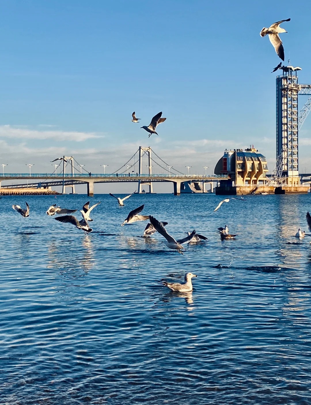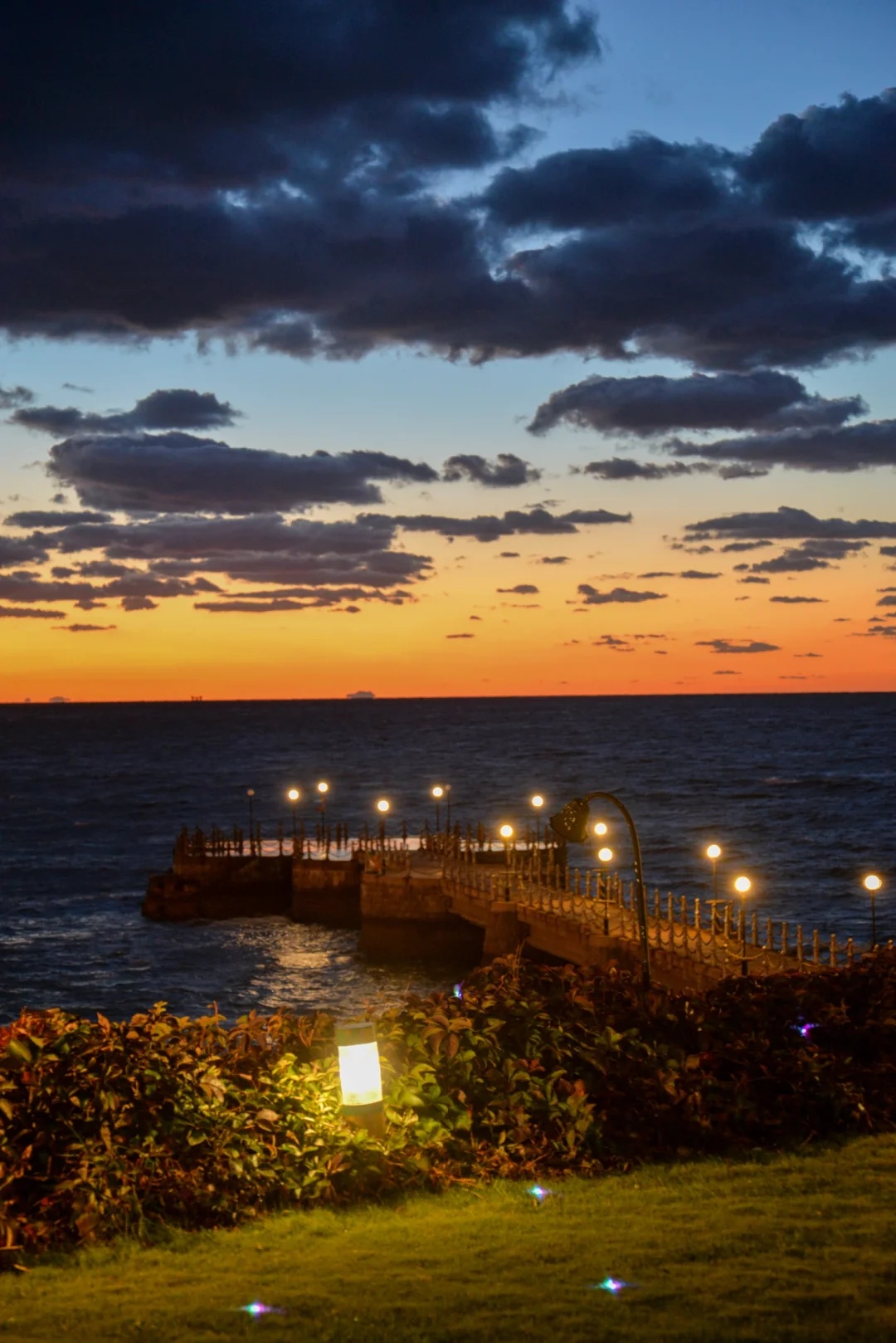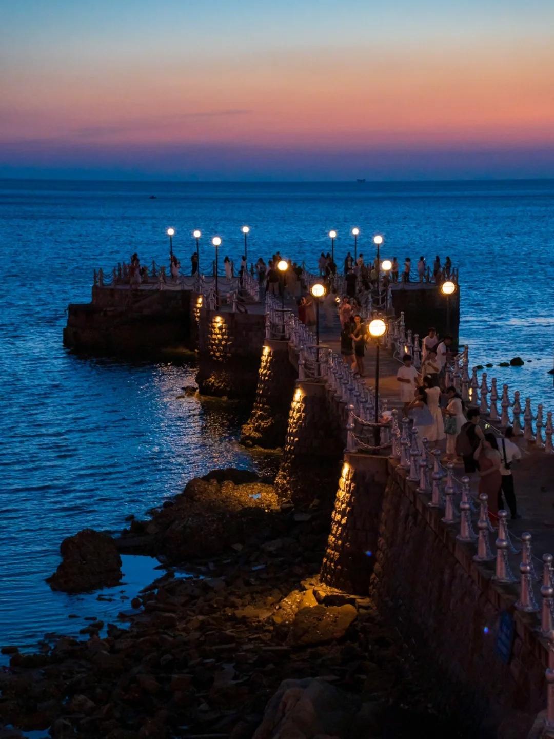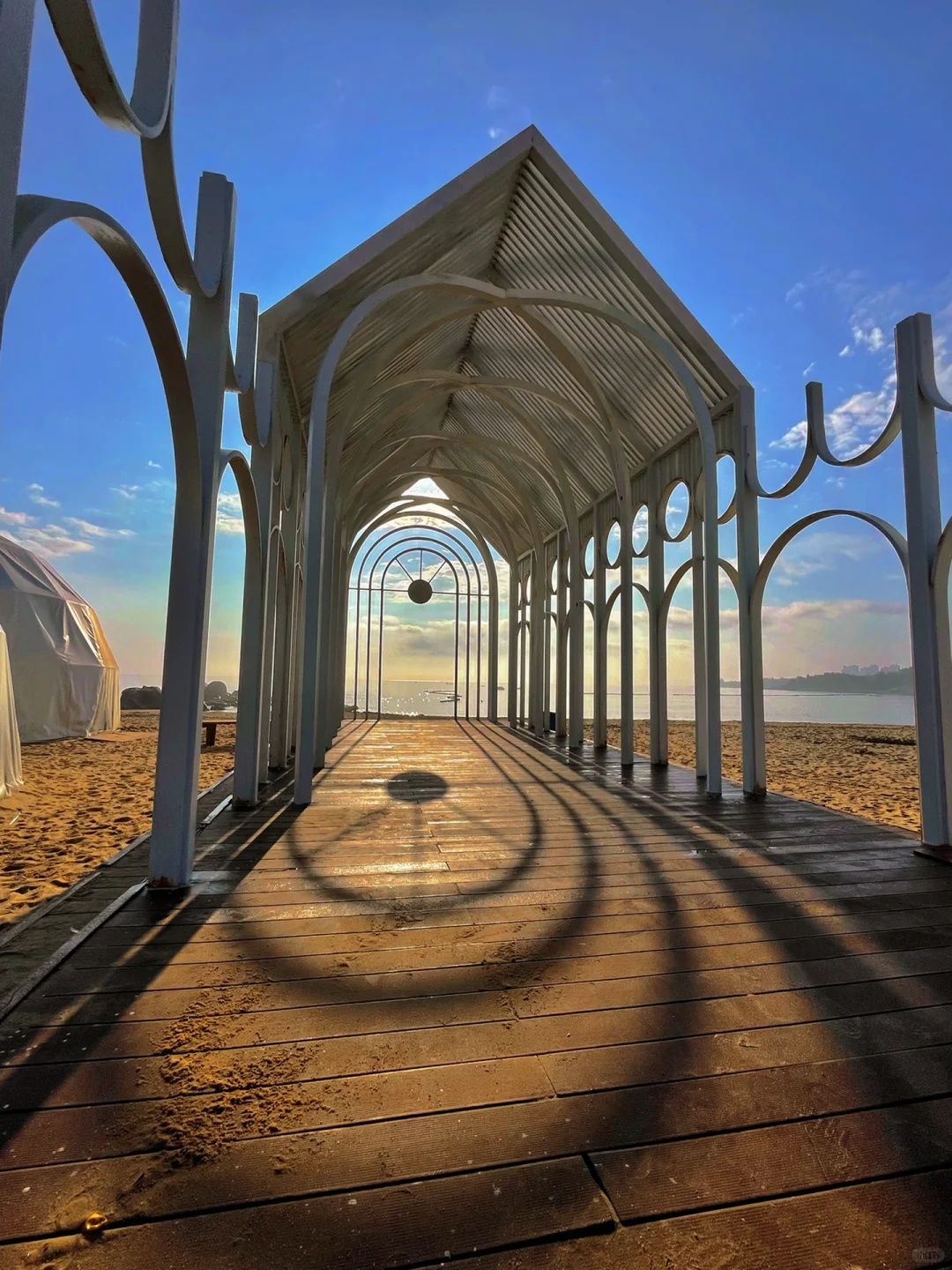 金海湾栈桥也是一处很热门的景点,这座锈迹斑斑的栈桥延伸到海中央,仿佛漂浮在海面上的桥,夕阳西下,阳光是金色,水是金色,栈桥的栏杆则是金光闪闪的红。