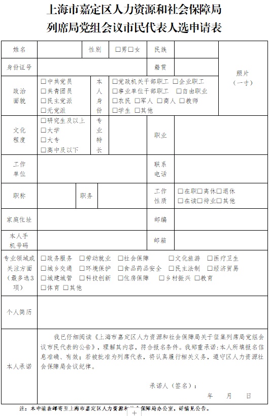 通过本公告内的附件直接下载申请表,如实填写表内的所有信息(信息虚假或不全,视为无效报名),填写后将申请表原件和本人身份证复印件寄送至上海市嘉定区人力资源和社会保障局(地址:上海市嘉定区金沙路68号1508室,邮政编码:201899,联系电话:59534035,信封请注明“列席区人力资源社会保障局党组会议市民代表人选申请表”)。