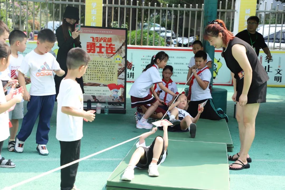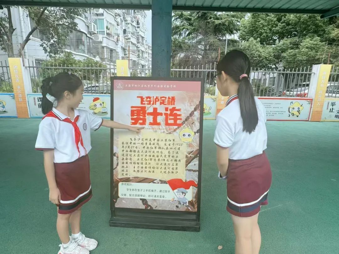 “重走长征路 心中一抹红”新时代好少年游园活动为学生们开辟了好玩的花式运动长征路线。翻雪山、过草地、强渡大渡河、强渡金沙江、四渡赤水……活动以红军长征途经的地名和重要事件设计瑞金出发、遵义会议等13个闯关打卡点,一块块以长征故事展板连接的运动打卡点,沿着教学楼周边铺展开来。配合着投沙包、跳长绳等趣味运动项目,孩子们在打卡挑战的同时重温了长征故事,不仅锻炼了身体,更在潜移默化中领略了深厚的爱国情怀,为中华人民共和国成立75周年献上最真挚的贺礼。