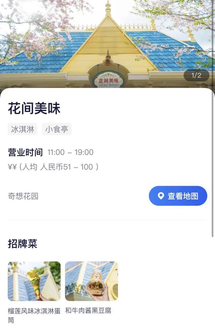 记者在迪士尼乐园APP上发现,乐园内“花间美味”小食店上架了两款新产品,分别是牛肉酱黑豆腐和榴莲冰激凌蛋筒,售价分别是40元和58元。