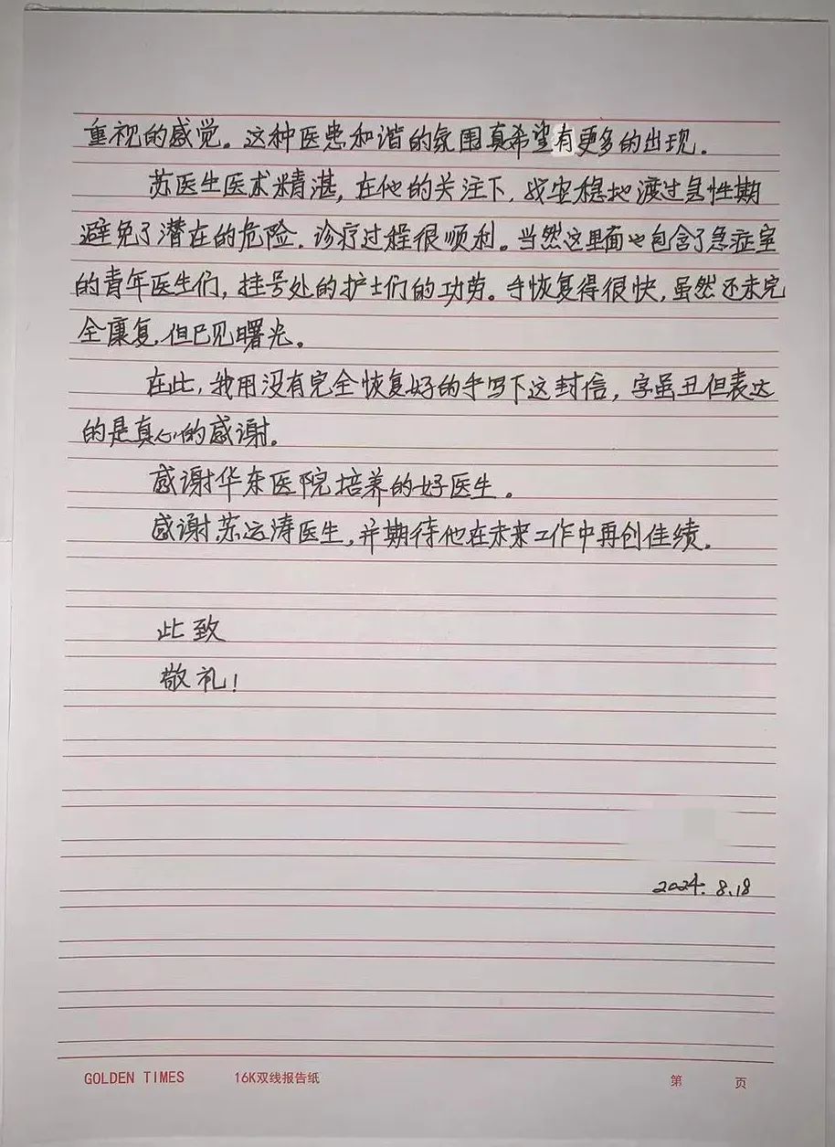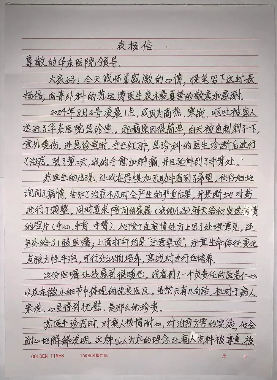 第二天一早查房时,普外科苏远涛副主任医师再次详细询问病史,结合杨阿婆的临床表现,初步判断:这不是单纯的软组织感染,不能排除创伤弧菌感染。于是赶紧调整用药方案,并另写了一张“注意事项”交给家属。经过医护的精心诊治护理,杨阿婆的手部感染情况逐步得到有效控制,也让全家松了一口气。