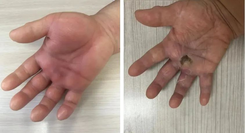 没想到,第二天凌晨1点,杨阿婆突发寒战、高热、呕吐、右手肿成“大馒头”。家人紧急送她前往华东医院急诊寻求帮助,急诊医生在完善相关检查后给予了对症处理。