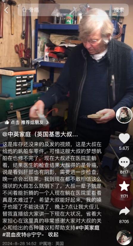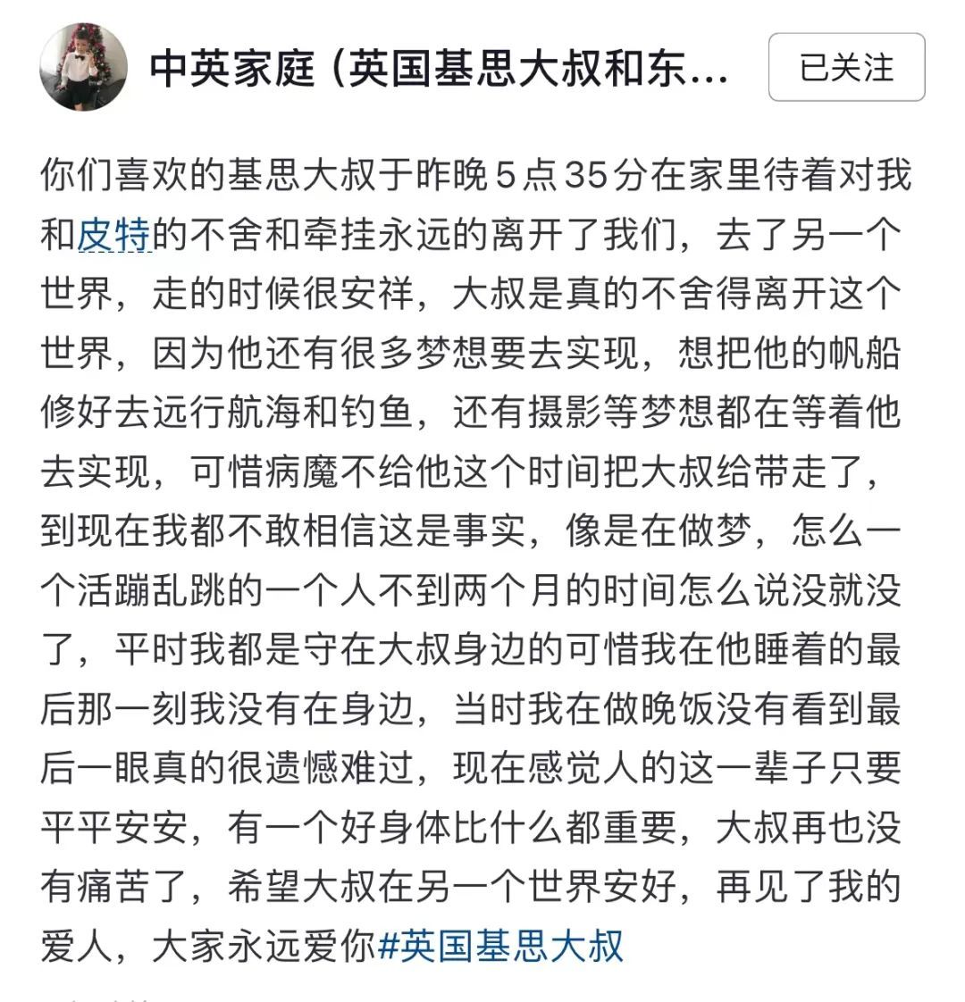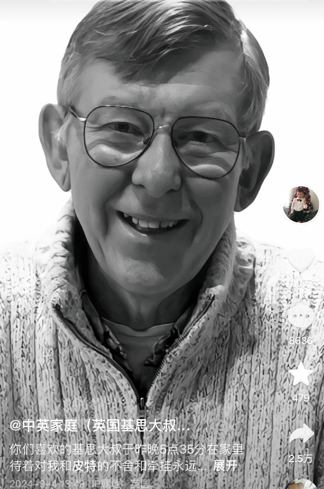 “吃干巴面包,抹干巴黄油,做干巴老头,品干巴人生”“干巴烂吃”……等由此而来的热梗也迅速走红网络,还带动了不少网友效仿,一起“品干巴人生”。8月20日,一直为基思大叔拍摄视频的妻子“东北大姨”(网友称呼)发消息称,结束了在中国的行程提前18天回国是因为大叔生病了。8月28日,基思大叔的检查结果公布,确定患上了骨癌。距离他于9月3日去世,刚刚一周时间。