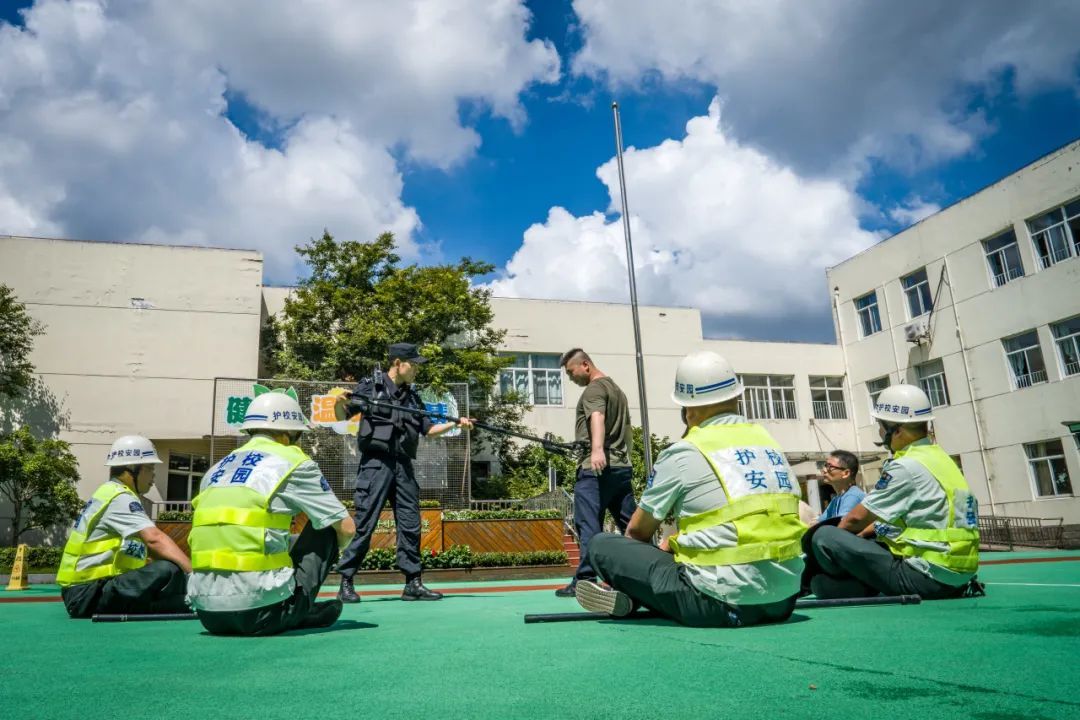 培训中,民警首先查看了校园安保人员配备、门卫制度落实、是否制定应急预案等情况,并检查了校园内安防设施、防护器材配备是否齐全。在对学校保安进行警务技能培训中,民警结合当前形势,以现场教学、交流互动等方式,详细讲解了防暴钢叉、防暴盾牌、警棍等常用防暴器械的功能和使用方法,重点指导如何利用防暴器械形成防护阵型应对突发情况并进行对抗演练,确保在遇到突发事件情况下,能够第一时间妥当处置。