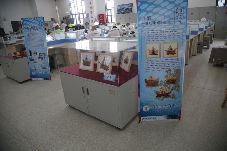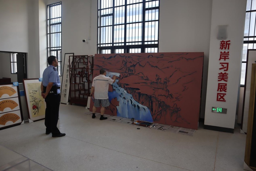 习艺区的右侧是“习美工作室”。习美工作室成立于1983年,当时提篮桥监狱选拔在绘画、书法、工艺制作等方面有特长的服刑人员,组织成立习美兴趣小组,逐渐发展成为监狱重要的文化品牌。四十年来,提篮桥监狱服刑人员的习美作品多次在上海乃至全国监狱系统获得各种奖项,成为了监狱文化改造的一面旗帜。近年来,习美工作室在传统的书画艺术之外,又拓展了铜丝画、木雕、制扇、墙绘、叶雕、竹编等新的艺术矫治形式。