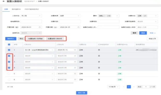 2.批量入账:纳税人如果存在多张发票需入账,且入账状态及入账时间相同的情况,可批量进行入账操作。