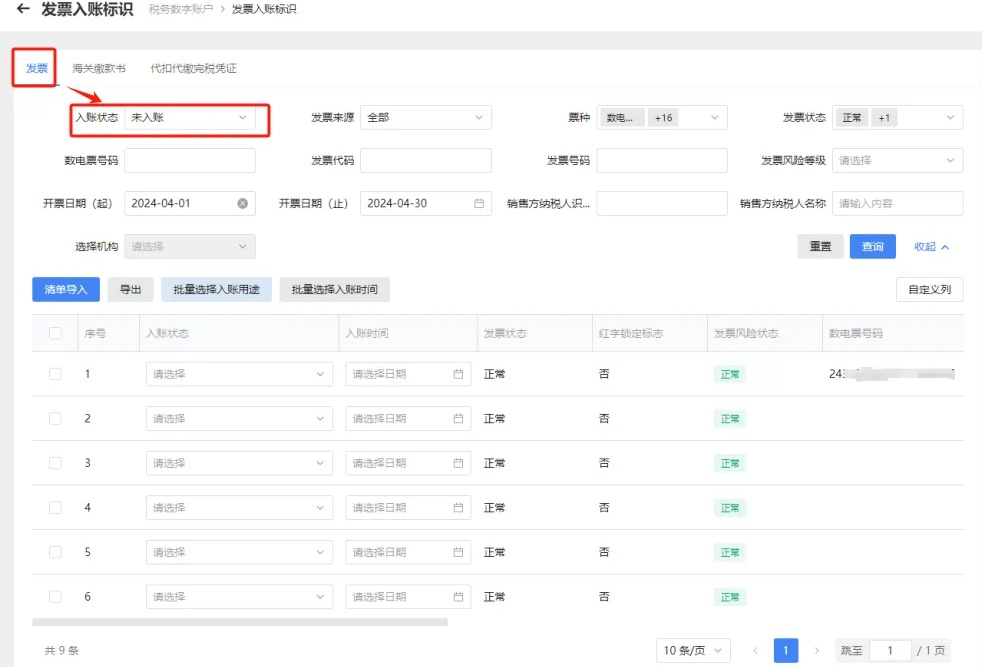 3.清单导入入账:纳税人若存在多张发票需要入账,且状态及入账时间不同的情况,可通过清单导入功能实现。