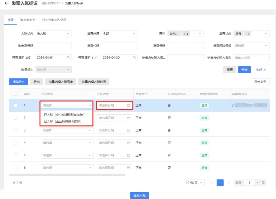 1.逐条入账:纳税人如需对单张发票进行发票入账操作,可勾选需要入账的发票信息,在下拉菜单中选择“发票入账状态”及“发票入账时间”,点击【提交入账】,在弹出提交入账确认框内点击“确认提交”,即可完成发票入账操作。