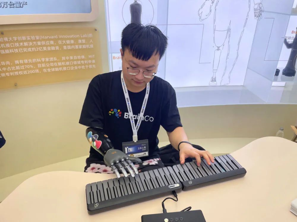 在“未来健康”展区,《大鱼海棠》主题曲《大鱼》音符缓缓流出,弹奏这首曲子的人是BrainCo智能仿生手体验官周键。失去一只手的他,能够再次灵巧地弹奏出动人音符,正是科技点亮生活的最好注解。另一名体验官高瑞霞也向记者讲述了自己使用智能仿生腿的过程,她表示,自己从恢复自然步态开始,逐渐能够爬楼梯,目前已经能够自如地跑步、爬山。