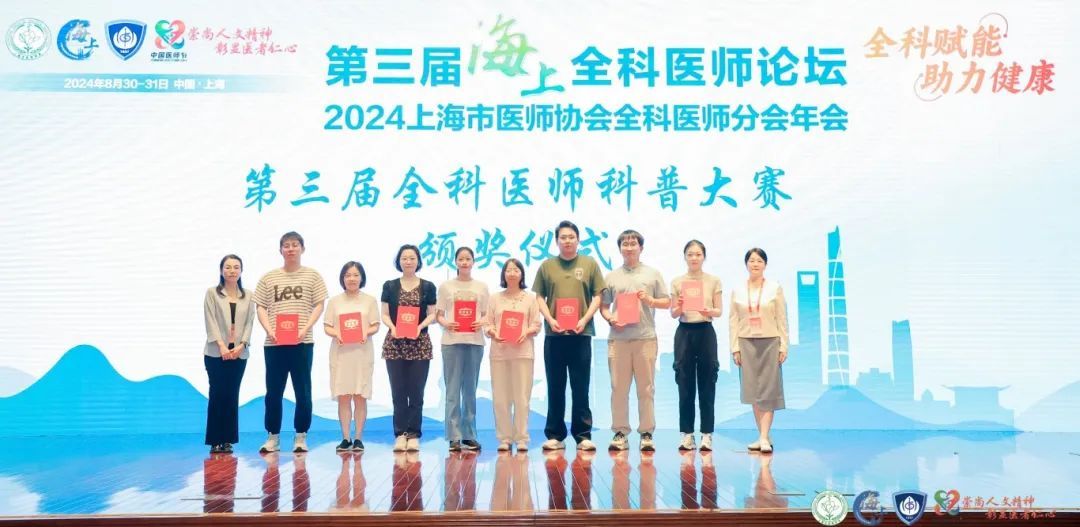 8月30日,由上海市医师协会、上海市医师协会全科医师分会主办的第三届全科医师科普大赛决赛在复旦大学附属中山医院东院区举行。同济大学附属同济医院全科医学科主任宋浩明团队的《美食美课》获得三等奖。8月31日下午,宋浩明带领科普团队成员(王琛、曾小云、王明珠、程洁)出席颁奖典礼并上台领奖。