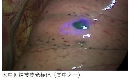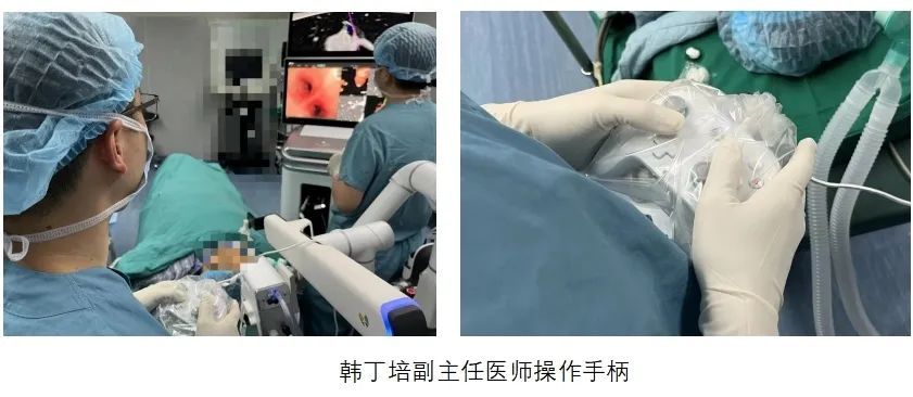根据术前规划的路径,韩丁培副主任医师操作机器人手柄,将气管镜导航至相应的几个结节定位标记位置,并向导管中注射荧光染料,标记定位球。随后,李鹤成主任和韩丁培副主任医师完成了单孔胸腔镜微创手术,通过侧胸壁3cm小切口,观察到胸膜表面的荧光标记,切除了患者的六个肺结节。