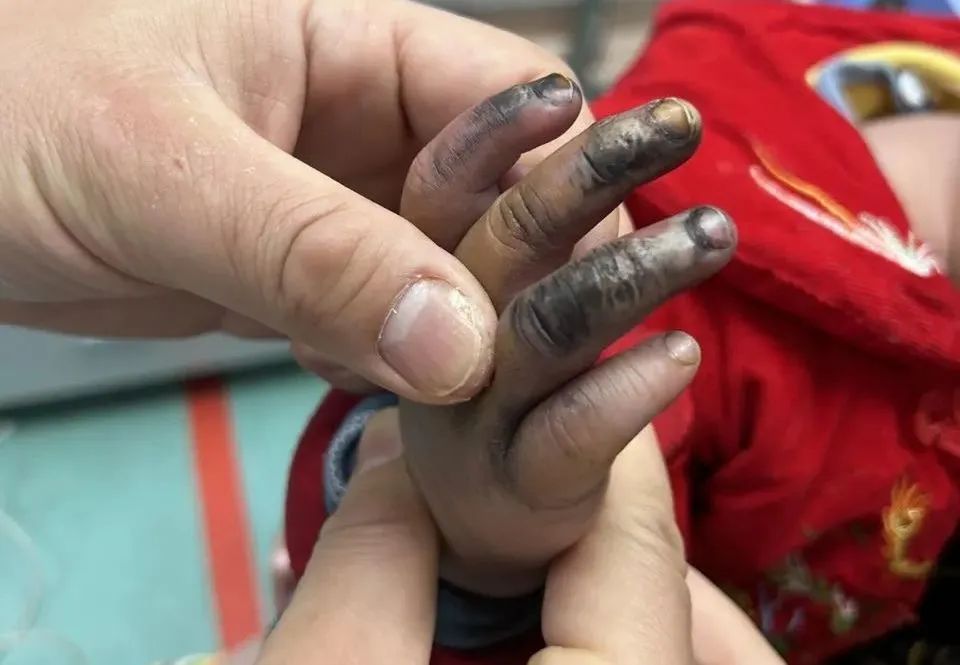 不久后,一对老夫妇和一个一岁多的宝宝在骑警的护送下进入急诊大厅。孩子的右手食指、中指和无名指严重灼伤,呈现出焦黑的痕迹,正哭得撕心裂肺。