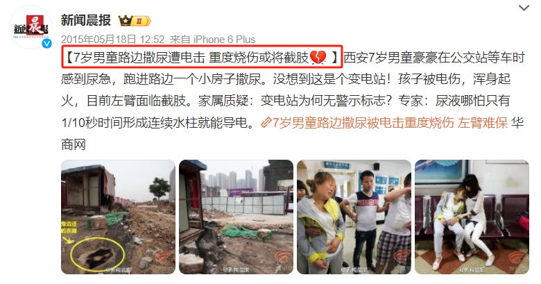 西安曾有一名7岁孩子在公交站等车时感到尿急,看到路边一个小房子,就进去尿尿。没想到,这是一个变电站!孩子被电伤,并被严重烧伤。
