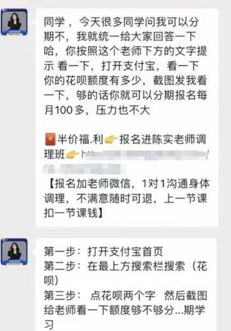 记者在完成问卷后,抽中了“6天健康养生训练营”免费直播课程,随后被拉进了微信群。在免费直播快要结束的时候,讲师开始推销“原价3960元,5折后1980元”的家庭健康宝典课程,对于一些表示支付有困难的学员,工作人员还推荐使用花呗分期、信用卡支付。