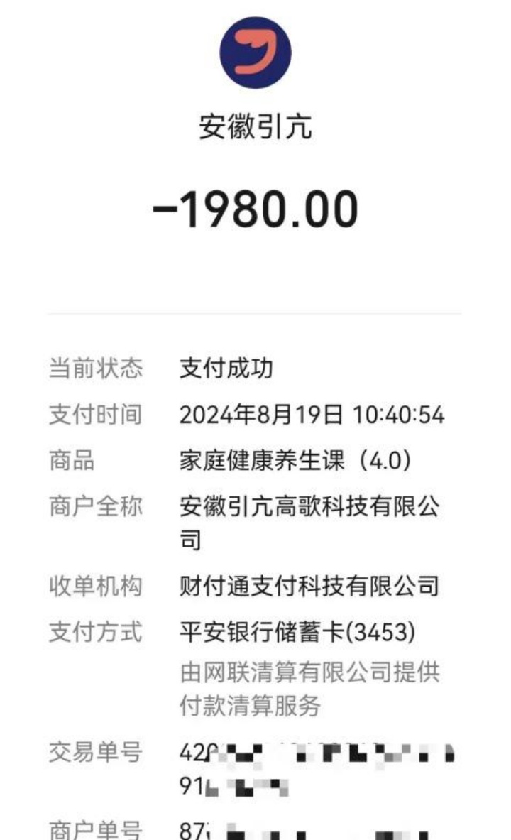 微信群内付款截图显示共9人报名。购买课程的收款方为安徽引亢高歌科技有限公司,该公司经营范围包含“养生保健服务(非医疗)”。