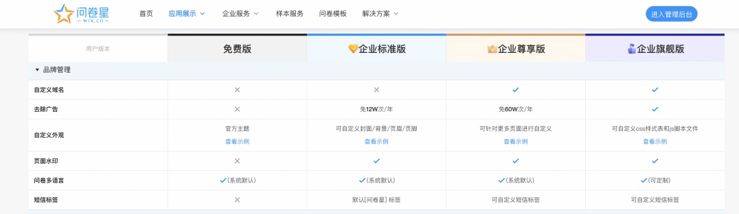 记者在问卷星官方平台发现,官方的应用展示页面显示,免费版的问卷星没有去除广告功能,默认自带尾部广告,可以去除尾部广告的版本2999元起。