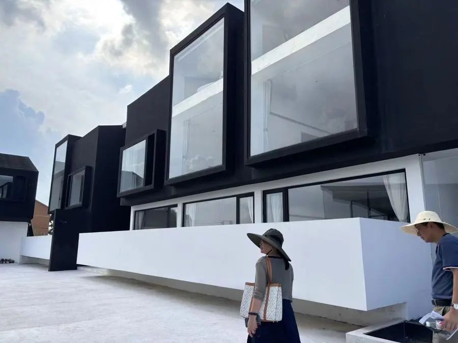几年前上海迪士尼落成,作为距离景区最近的保留村,纯新村也很快成了“民宿集聚地”。村子内有一家“千墨”民宿,在小红书平台上颇有名气,被称为“稻田里的守望者”。民宿以大片的黑白作为主要色调,整体建筑风格呈现“极简风”“现代风”,与周围的传统水乡民居与建筑前的大片稻田形成鲜明对比。