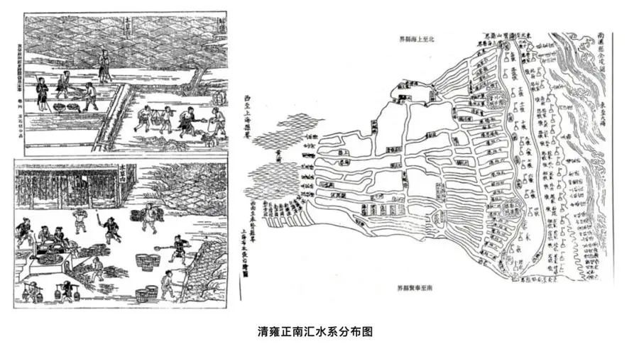 纯新村的风貌,与它的发展史有不可分割的关系。拿一张清朝水利图,可以清楚地看到这一由制盐形成的独特地貌:东西走向的主河道,似波浪般向前层层推开,一代代人们就在这些波浪之间繁衍生息。如今在纯新村,50条河道几乎贯穿每一条道路,横波梳状的乡村肌理保留完整。