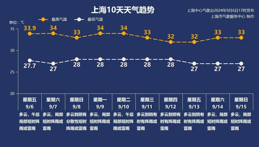 “白露”节气将至,趋势来看,上海又是被副高硬控的一天又一天。俗语说“白露身不露”,但今年的“白露”暑热依旧没有退去,最高气温多维持在34℃上下,早晚最低气温也有27~28℃。